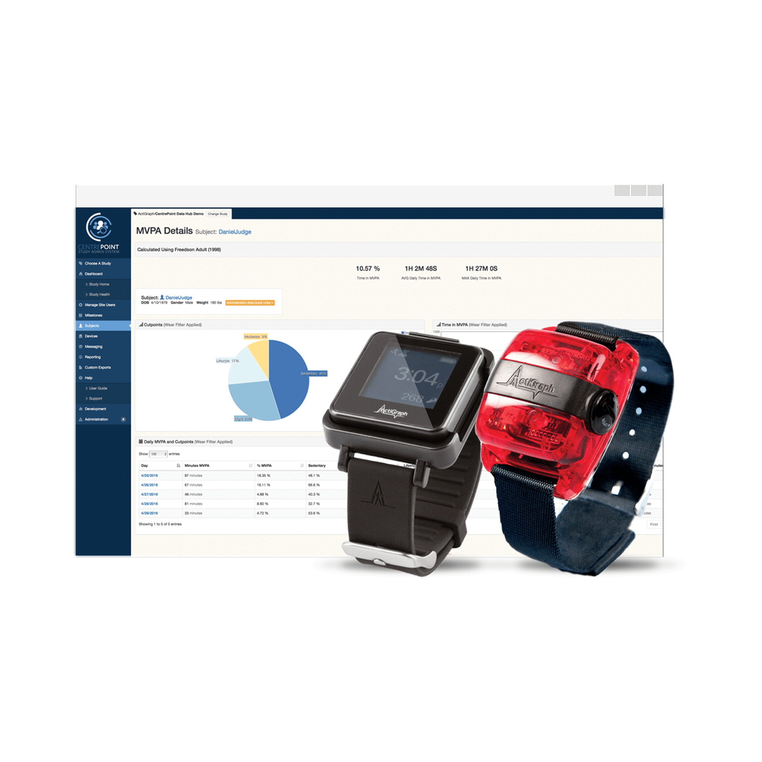 The compact and stylish CentrePoint Insight Watch captures and records continuous high-resolution raw acceleration data, sampled up to 256 Hz, to support the development of novel endpoints related to real-world activity, mobility, and sleep behaviors to provide objective, real-world physical activity, mobility, and sleep measures, in near real time.