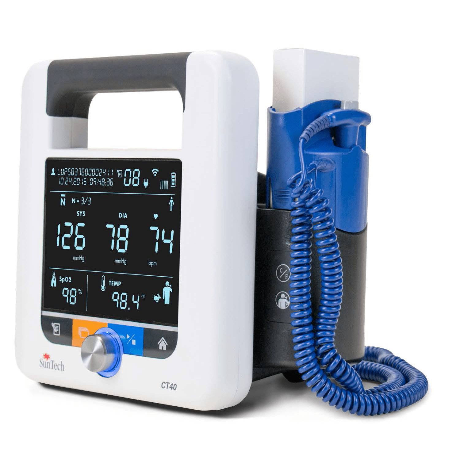 SunTech CT40 is the ideal, affordable solution for clinical-grade spot-check measurements of blood pressure plus vital signs in hospitals and clinics. Ambulatory care, long-term care and low-acuity hospital departments can easily implement this versatile, user-friendly vital signs device that delivers SunTech clinical-grade performance, advanced features and digital connectivity.