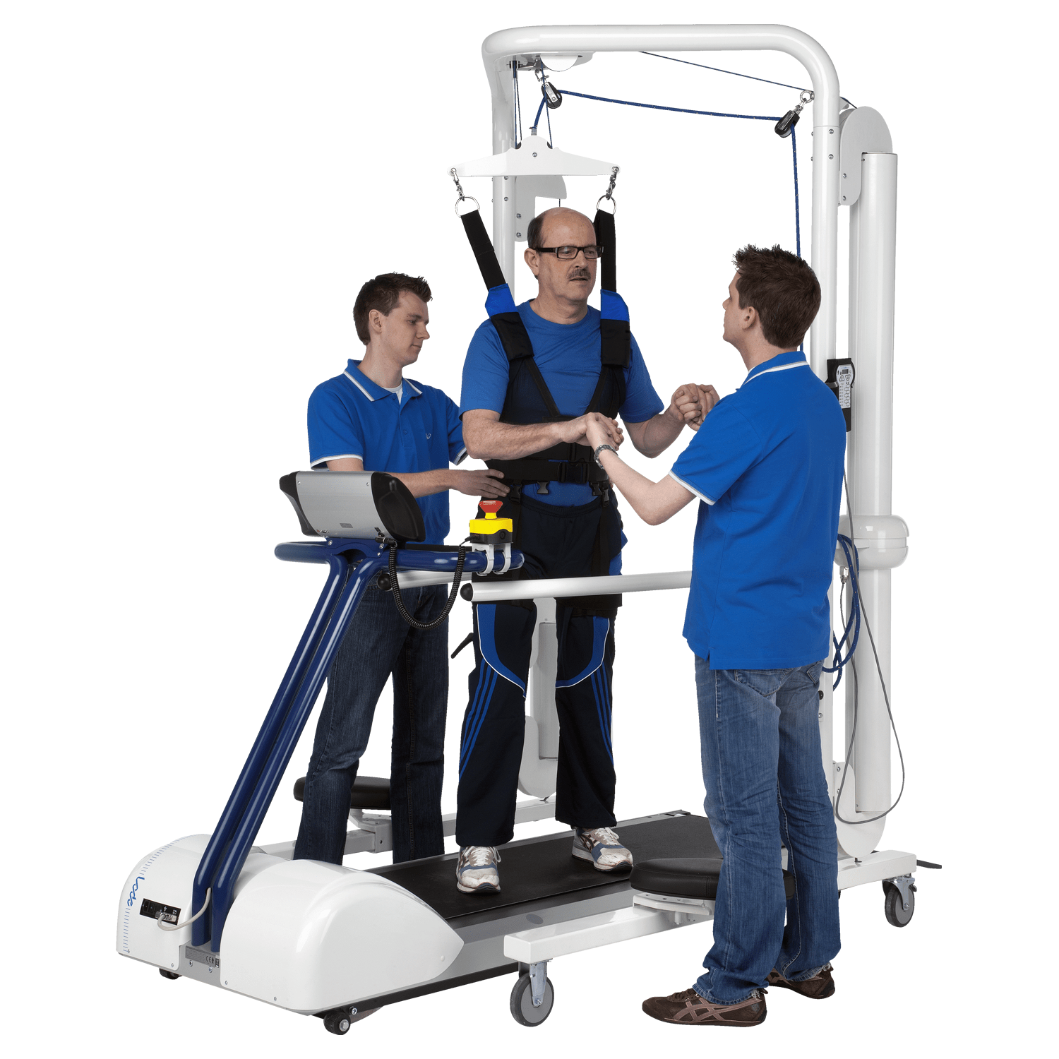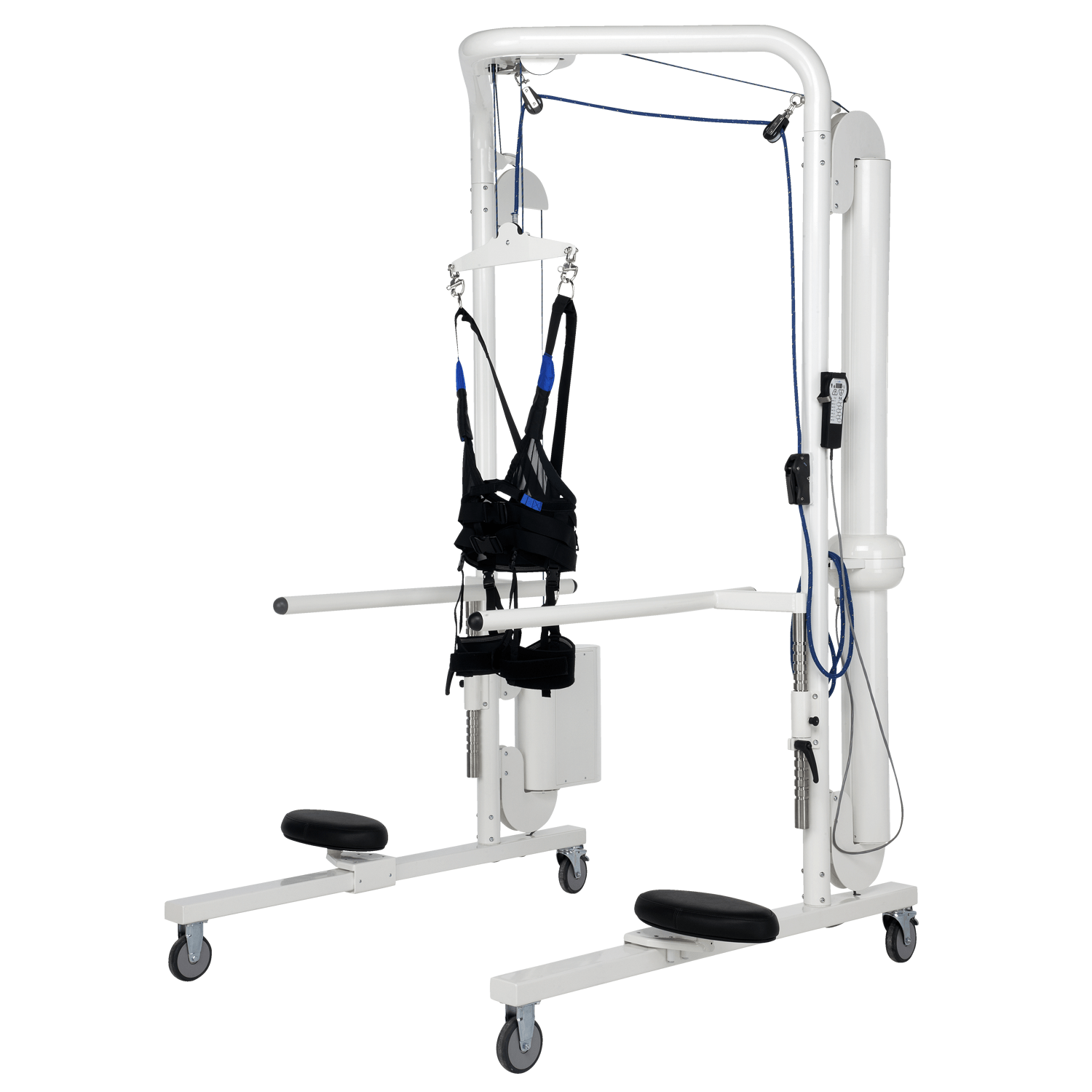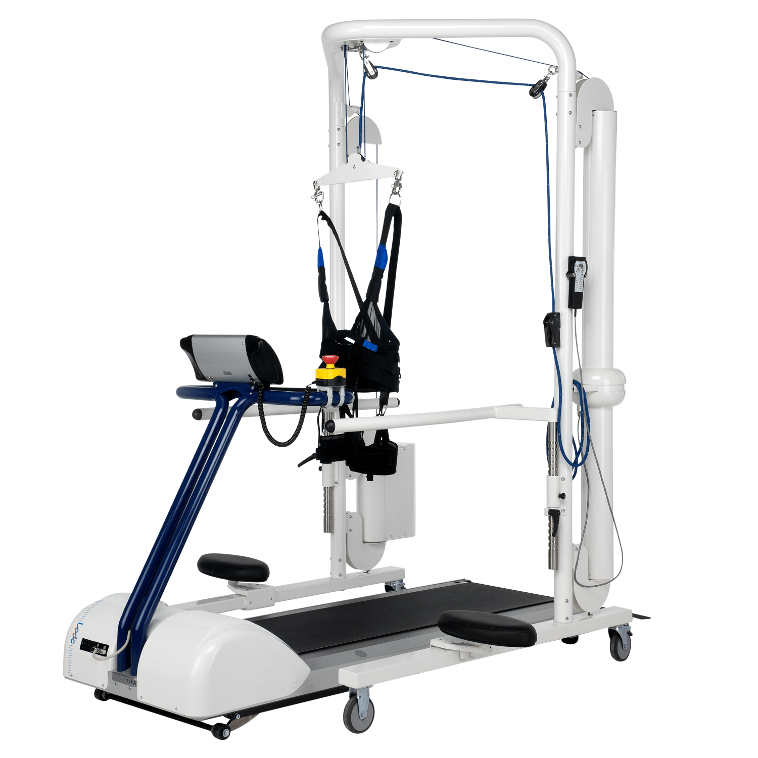 The Lode Body Weight Support System (BWSS) is especially developed to support patients that are not able to walk independently. They need support in order to be able to learn how to walk again. The Lode BWSS is the perfect product to enable this. During the training session, the patient weight can be supported accurately up to 80 kg, allowing a broad range of patients to use the system. The compensation weight can easily be adjusted with a remote control. The weight is compensated through a Unique use of spring combinations, which is a breakthrough and provides the most stable compensation system. This system is suitable for treadmills with a maximum walking surface width of 60 cm. It is standard supplied with a harness size M.