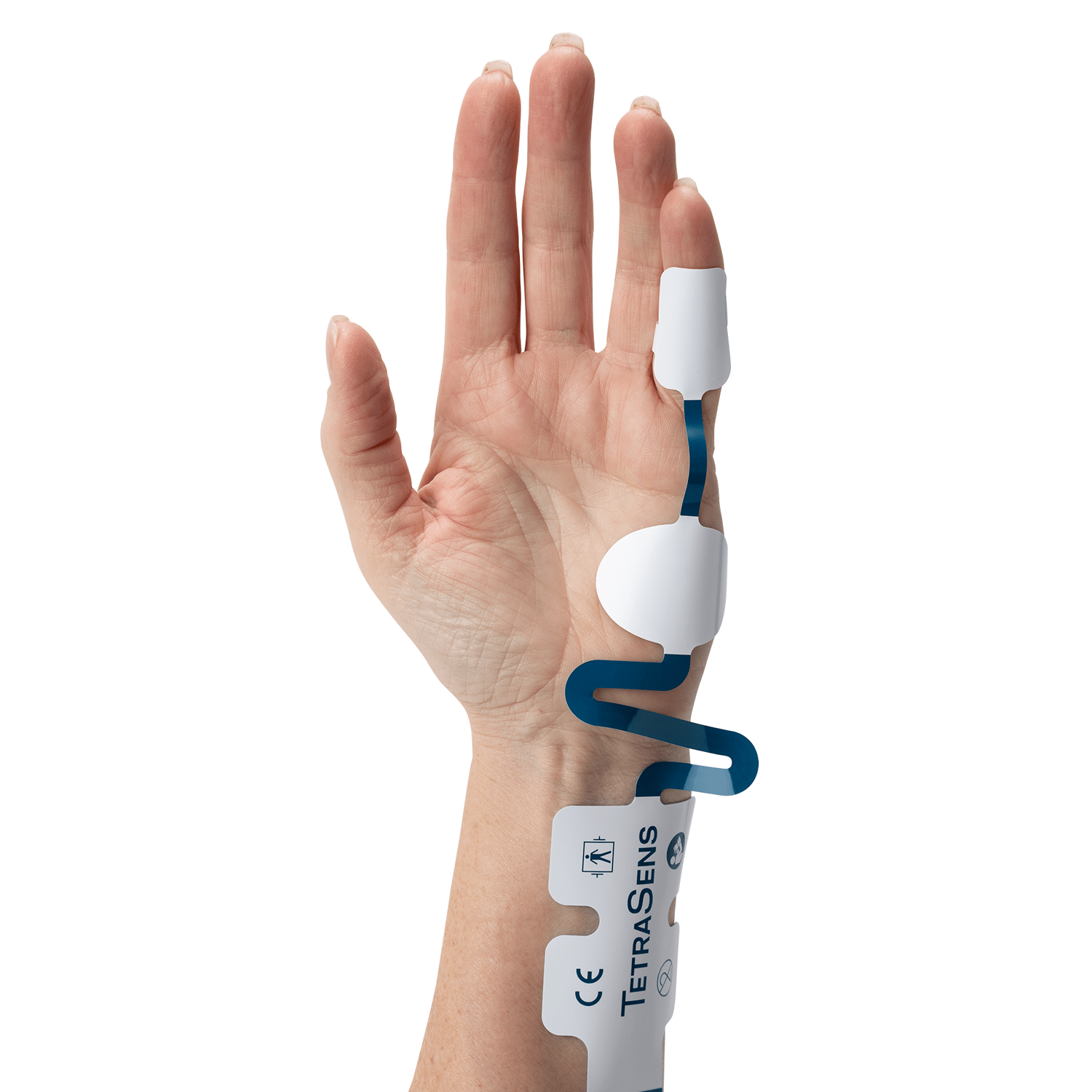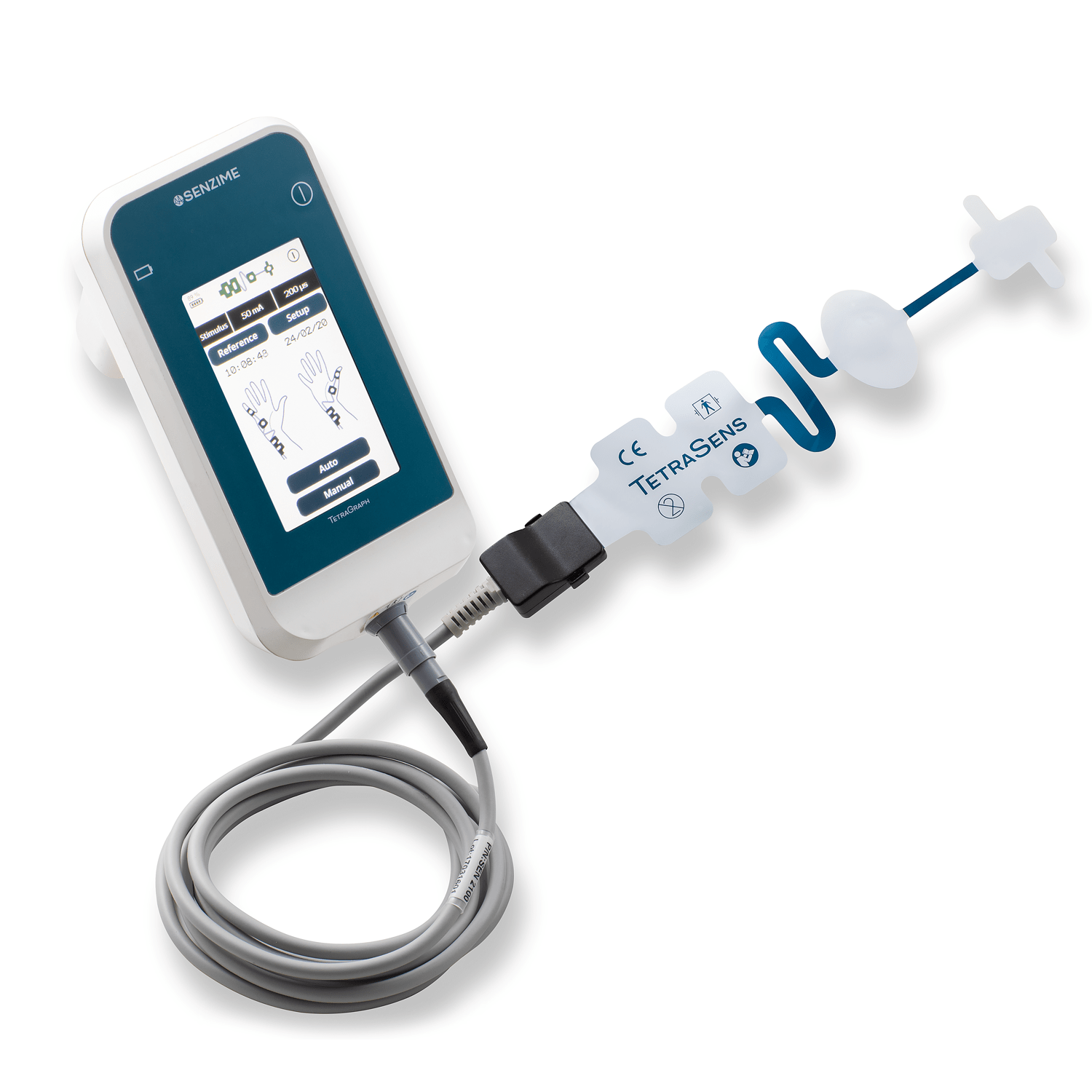 TetraSens electrode array has two proximal stimulating electrodes, one recording electrode and one reference electrode. The application is easy and quick. TetraSens electrode array is for single-patient use in order to avoid cross contamination. The electrodes can be applied on either hand, with the stimulation electrodes over the ulnar nerve at the wrist and the evoked response recorded from any of the hand muscles; typically, either the muscle at the base of the little finger (abductor digiti minimi muscle), or, more commonly, from the muscle at the base of the thumb, adductor pollicis muscle. TetraSens can also be placed on the FDI muscle (first dorsal interosseous). When the hand is inaccessible, the posterial tibial nerve (flexor hallucis brevis muscle), can be used for NMT monitoring.